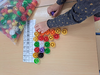 Las pinzas de letras sirvieron para formar palabras otoñales como N U E Z y con los tapones de colores pudimos contar cada cantidad de forma divertida.